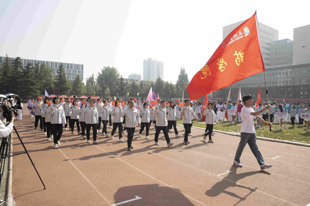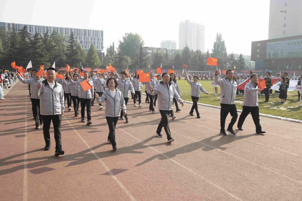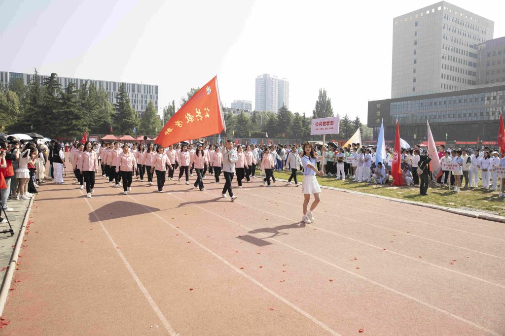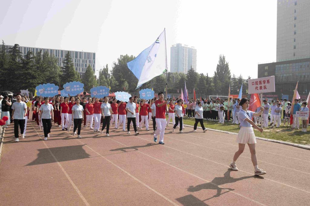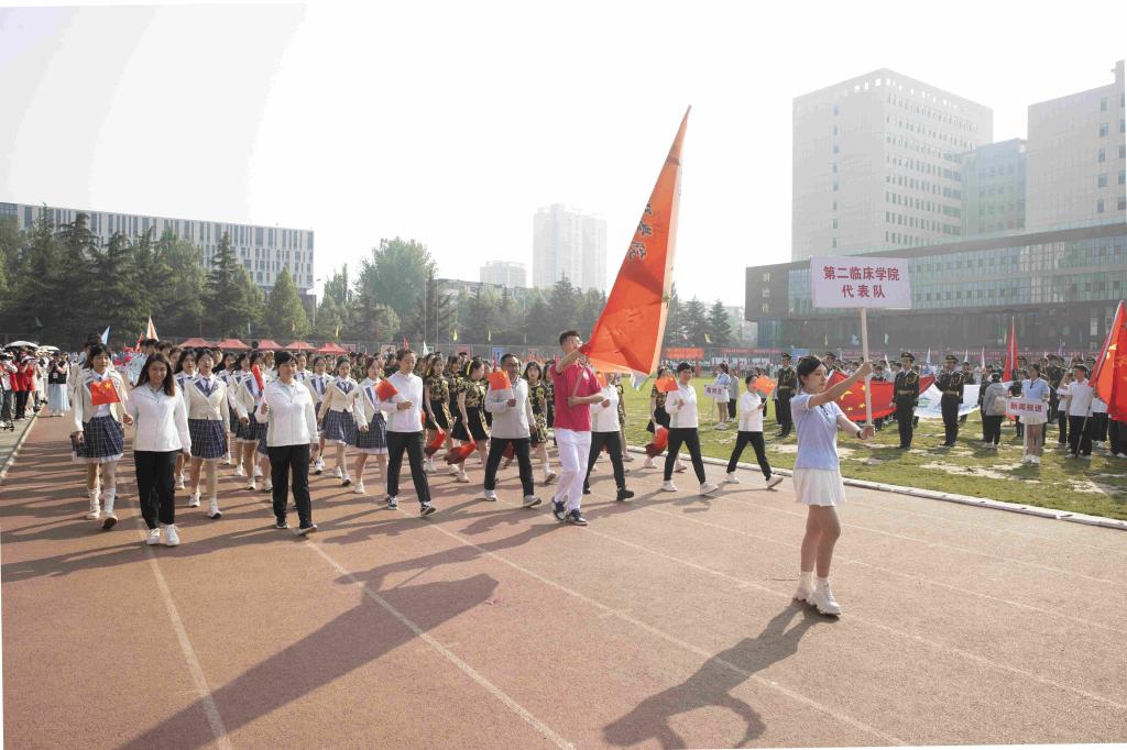 步履铿锵,红旗飘扬。伴随着激昂的音乐,国旗护卫队、红旗队、裁判员队、新闻报道队、离退休人员代表队、各附属医院代表队、各院系(部)代表队、机关代表队、后勤代表队、公共教学部代表队、教辅代表队等30余支代表队依次入场。他们列队整齐、步伐坚定,精神抖擞、意气风发地走过主席台,用激情嘹亮的口号和独具创意的表演展现出长医人乘风破浪的坚定信心。