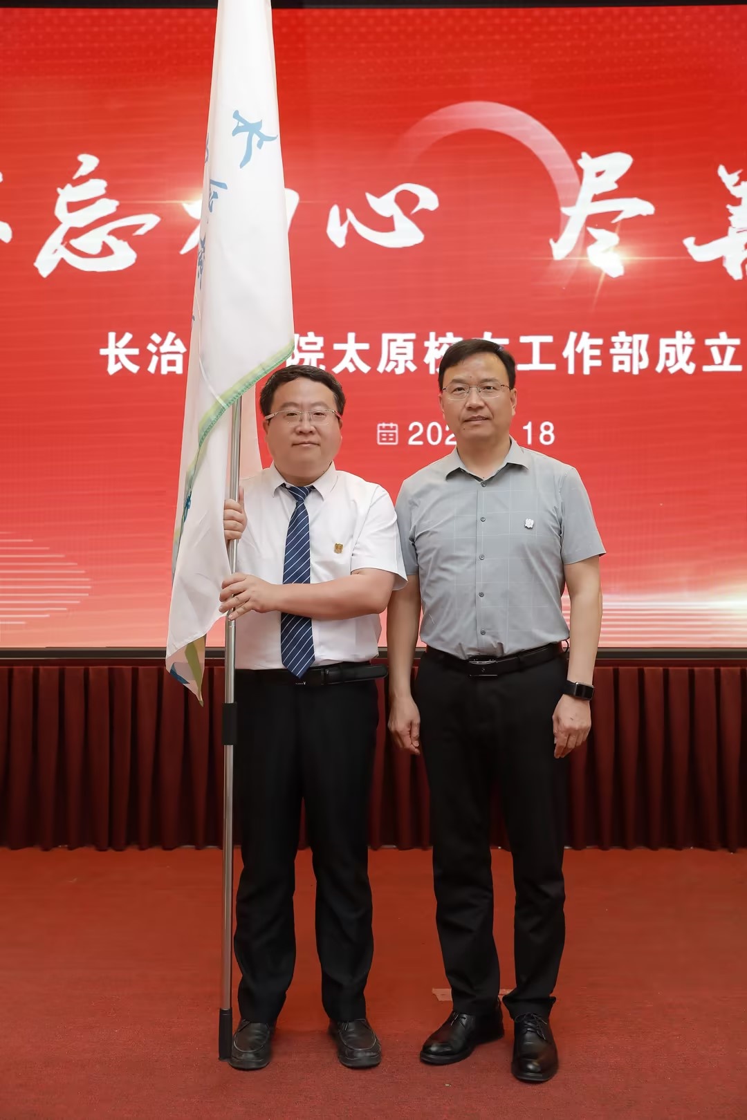 王金胜为太原校友工作部授旗并为工作部成员颁发聘书。