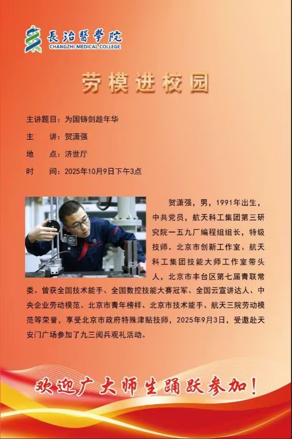 贺潇强,男,1991年出生,中共党员,航天科工集团第三研究院一五九厂编程组组长,特级技师。北京市创新工作室、航天科工集团技能大师工作室带头人,北京市丰台区第七届青联常委。曾获全国技术能手、全国数控技能大赛冠军、全国云宣讲达人、中央企业劳动模范、北京市青年榜样、北京市技术能手、航天三院劳动模范等荣誉,享受北京市政府特殊津贴技师,2025年9月3日,受邀赴天安门广场参加了九三阅兵观礼活动。